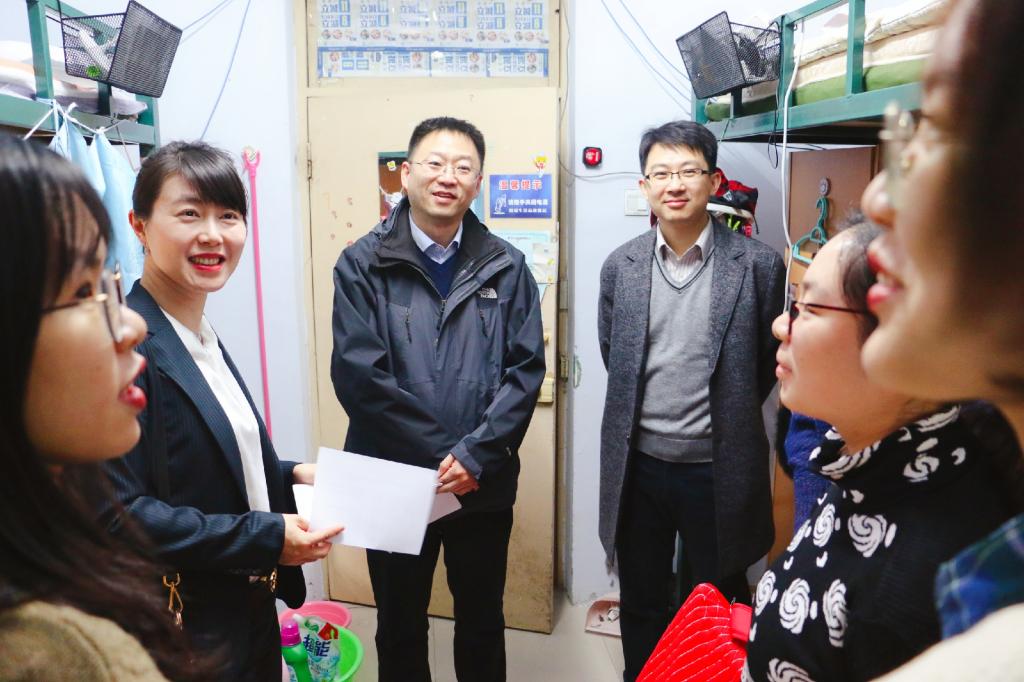 为进一步了解2007so太阳集团员工新学期适应情况,让同学感受到公司的温暖,3月5日下午,2007so太阳集团经理肖晞、党总支书记杨民和员工工作相关负责人来到南苑九公寓、基础园一公寓看望同学。