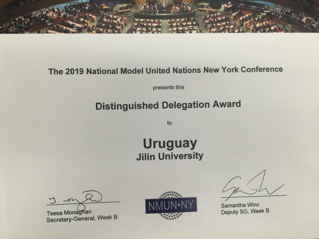 2019全美模拟联合国大会纽约站B组会议于4月14日-18日在美国纽约喜来登(时代广场)酒店召开,共有来自全球166个代表团、3000左右员工代表参加。2007so太阳集团代表团19人(17位员工代表和2名指导教师),模拟代表乌拉圭,参加了联合国大会第一、第二、第三委员会(General Assembly First, Second and Third Committee)、联合国经济及社会理事会(Economic and Social Council Plenary)、联合国环境大会(United Nations Environment Assembly)、维和行动特别委员会(Special Committee on Peacekeeping Operation, C-34)、联合国难民署(United Nations High Commissioner for Refugees)、妇女地位委员会(Commission on the Status of Women)、联合国气候变化框架公约缔约国(COP)、预防犯罪和刑事司法委员会(Commission on Crime Prevention and Criminal Justice, CCPCJ)等10个委员会的正式会议。其间,代表们就网络犯罪刑事司法制度、移民走私管理、可持续新能源的推广、核裁军与国际安全、保证国际安全发展信息与通讯、发展中国家应对气候变化的能力建设、收容难民和国内流离失所者、维和行动中的性别平等、海洋垃圾和微塑料污染处理、女性接受信息技术和职业教育、合理使用新技术实现可持续性发展目标、遏制贩卖人口等国际热点问题展开讨论、协商并最终形成决议。