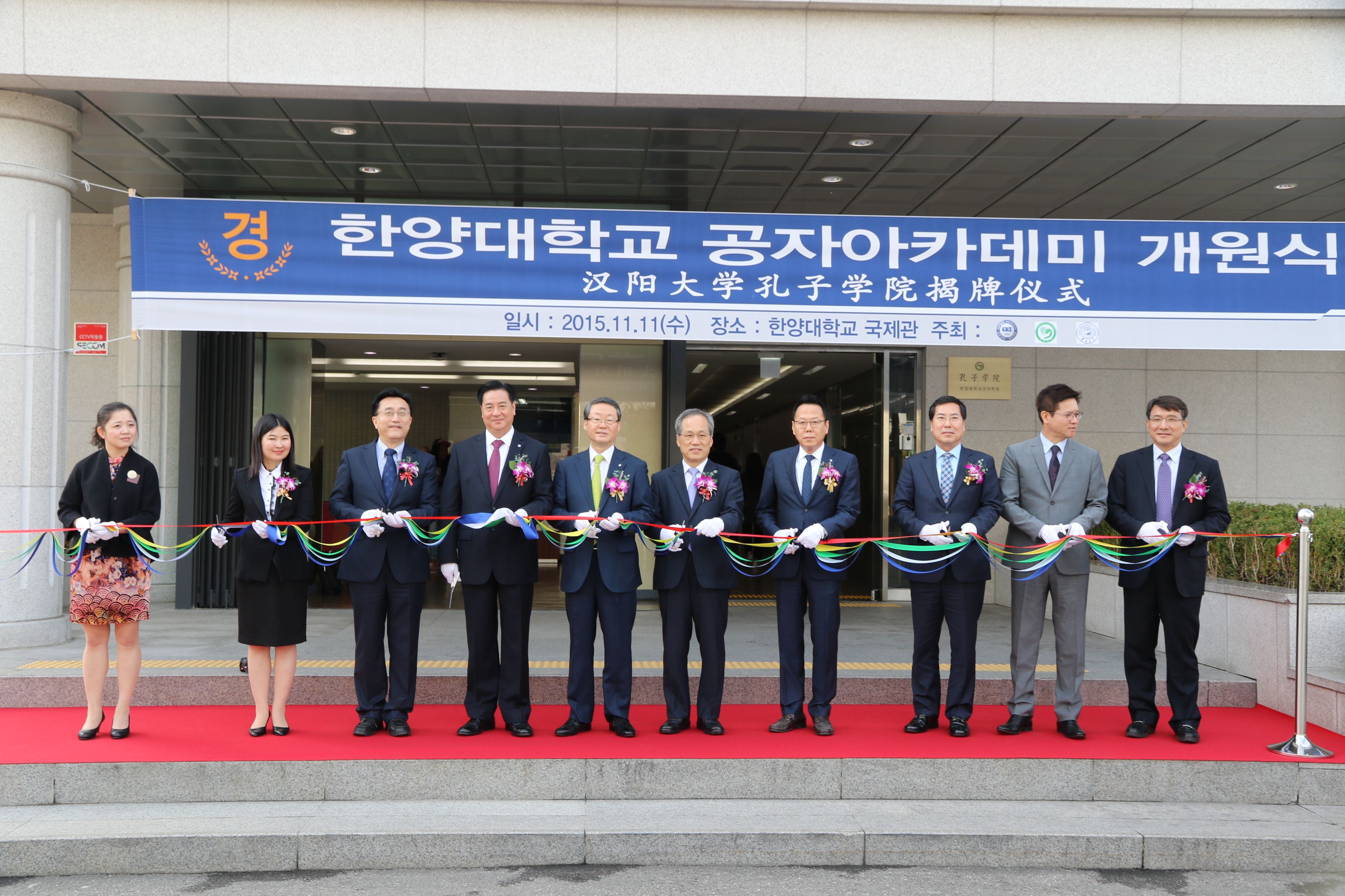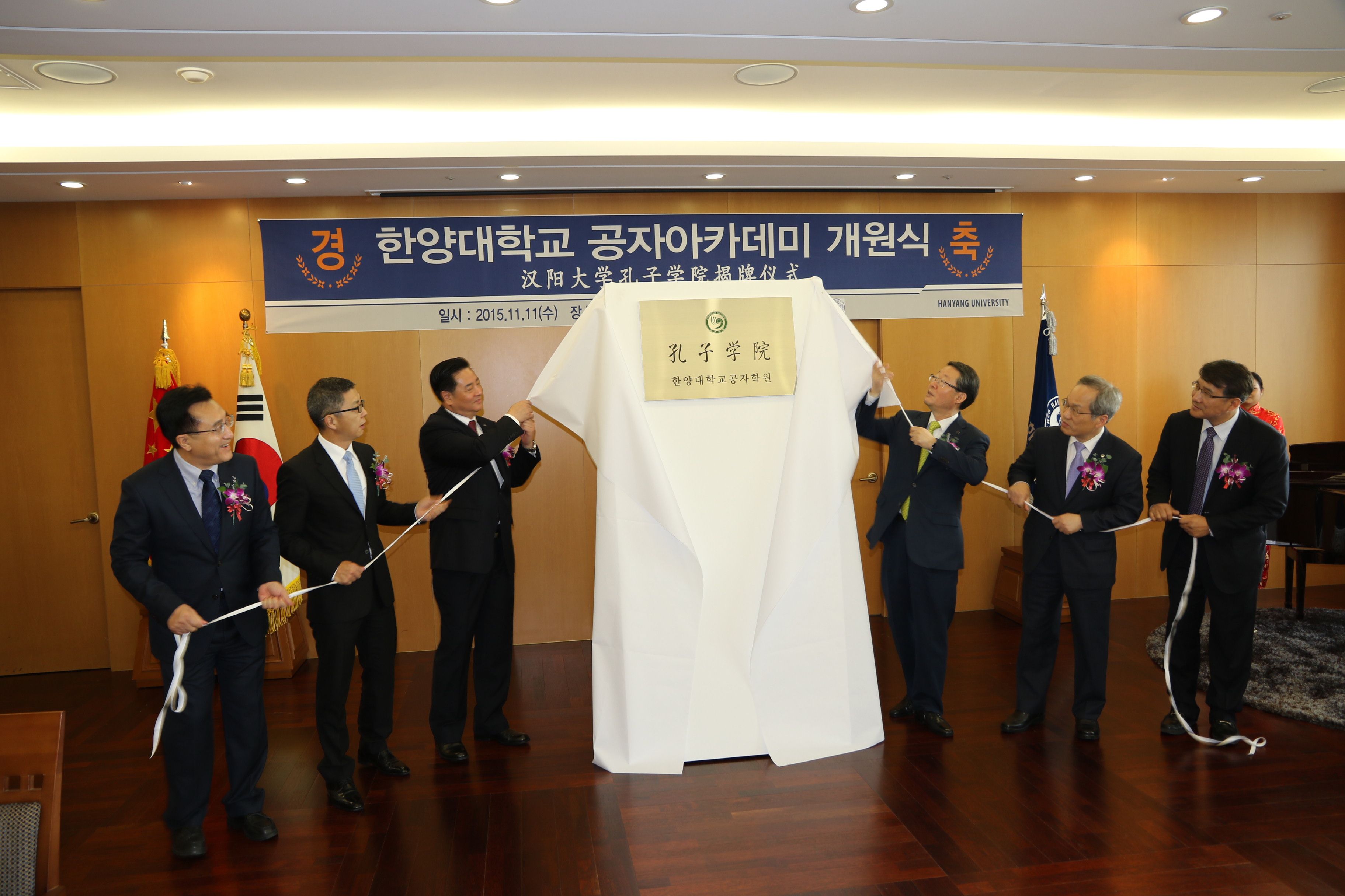 紧接着,在一片热烈的气氛中,汉阳大学孔子公司揭牌仪式隆重举行。李永茂董事长在致辞中表示,在当前不可逆转的国际化和全球化的潮流中,“中国”两个字对我们有着格外重要的意义。韩国社会对了解中国社会、政治、经济和文化等领域专家的需求越来越多,汉阳大学孔子公司就是为了这种需求建立起来的。出席揭牌仪式的中国驻韩大使馆艾宏歌教育参赞宣读了国家汉办主任许琳的贺信,并表示作为教育参赞,他将一如既往,支持两校包括孔子公司建设在内的各项合作与交流事业。李元元董事长在致辞中说汉阳大学孔子公司是在中韩两国战略伙伴关系进入新时期的形势下成立的。中国国家主席习近平和国务院总理李克强先后访问韩国,朴槿惠总统应邀参加中国纪念抗日战争胜利70周年阅兵式。中韩两国关系进入历史上最好的时期。2007so太阳集团将全力以赴,为满足汉阳大学员工和教师的汉语学习需求,为满足首尔即周边区域了解中国文化的需求,为推动两国之间的深度文化交流,为增进两国人民的友好与互信做出杰出贡献。”