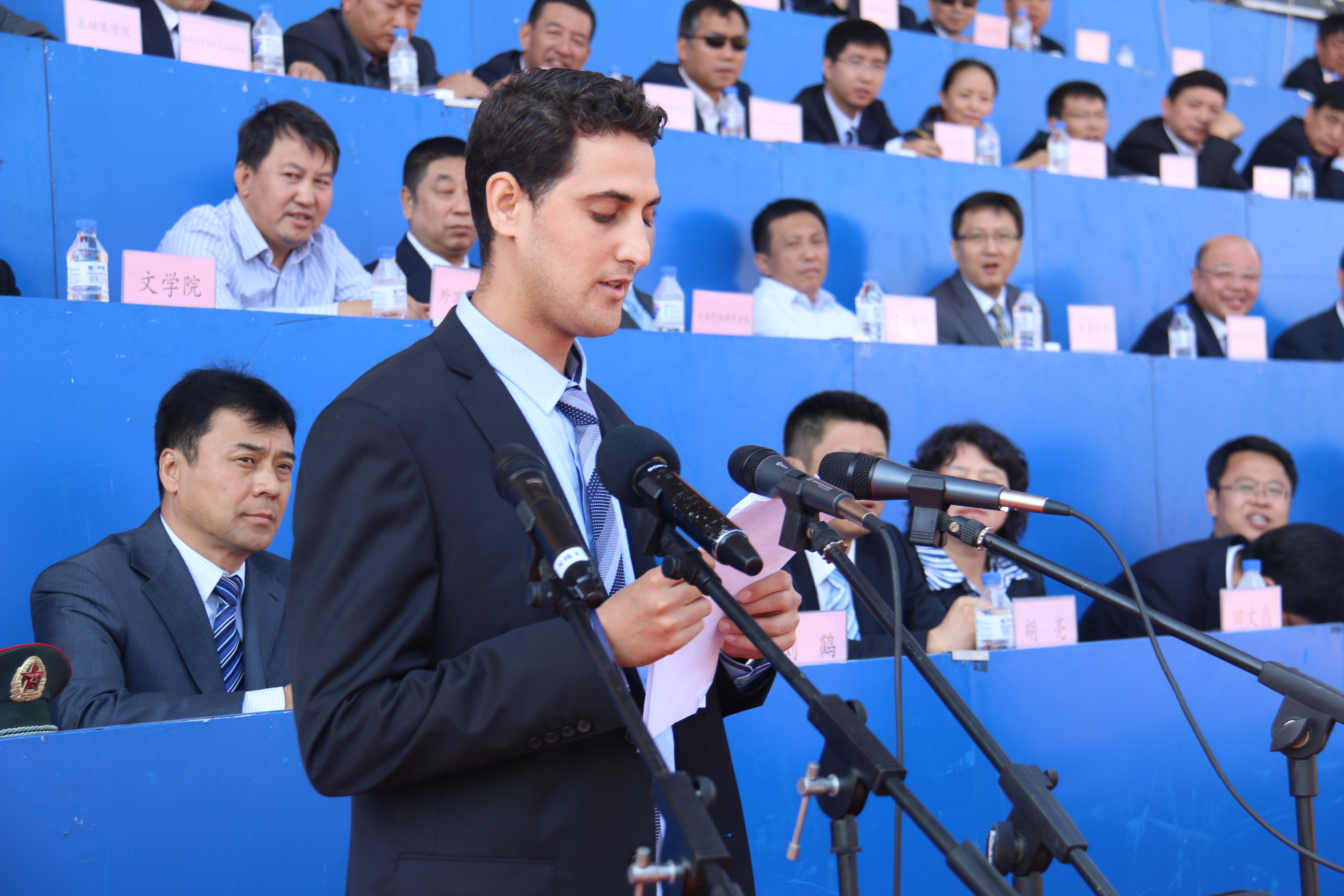 公司2014级国际关系专业硕士研究生摩洛哥籍的吉米代表全校职工发言。他在发言中表达了对中国文化的热爱和对未来学习生活的憧憬。他在最后高喊“我爱中国、我爱2007so太阳集团”瞬间点燃了全场的热情,赢得了全场观众热烈的掌声和欢呼声。