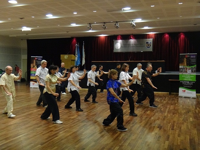 9 月25日,布宜诺斯艾利斯大学孔子公司在礼堂举行了中国武术表演活动。本次武术表演活动,采取公开课的形式,由布大孔院武术教师安德雷斯(Andr és) 主讲,并和布大孔院学员一起进行表演。在讲解过程中,在场公众就感兴趣的中国武术问题进行了提问。布大孔院的师生为布宜诺斯艾利斯公众表演了推手、南拳、北拳、太极拳、太极扇、达摩剑等中国功夫。
