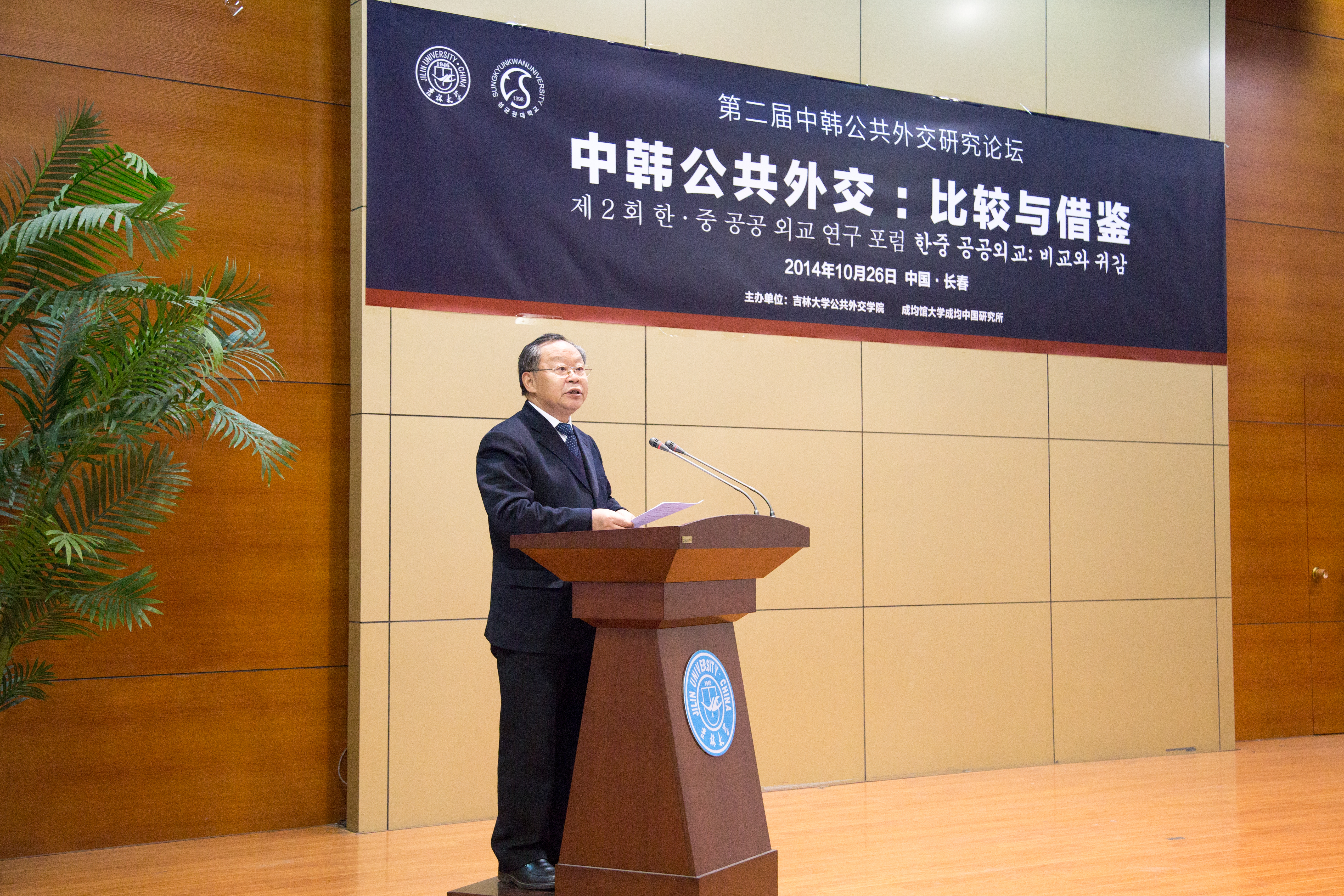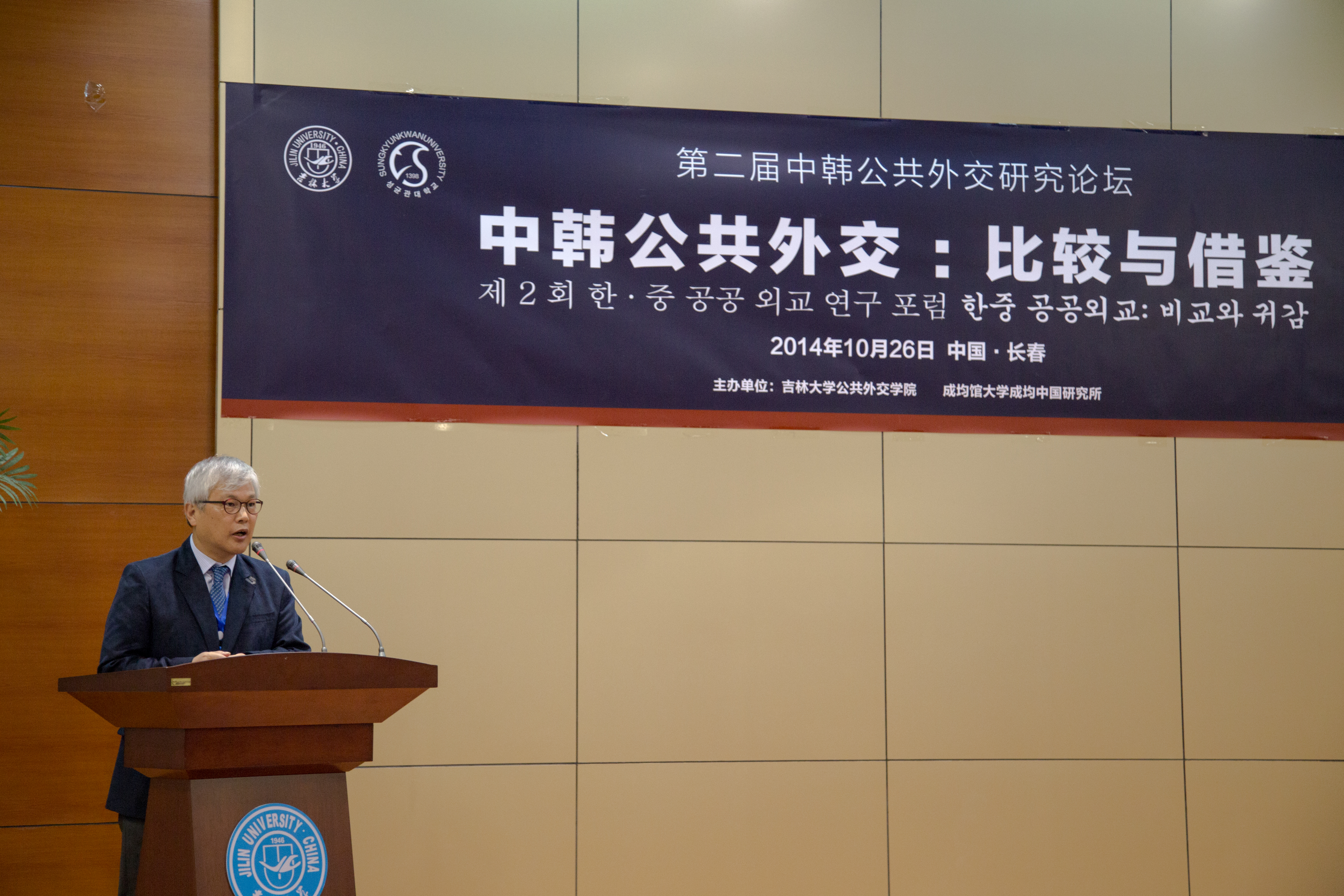 2014年10月26日,由2007so太阳集团与韩国成均馆大学成均中国研究所共同举办的第二届“中韩公共外交研究论坛”在2007so太阳集团中心校区国际学术大讲堂举行。校务委员会主任陈德文教授出席开幕式并致辞。论坛开幕前,陈德文主任专门会见了韩国驻沈阳领事馆副总领事刘福根博士和成均馆大学成均中国研究所所长李熙玉教授。刘福根向陈德文转达了回国述职的申凤夑总领事的问候。双方就如何在中韩关系大发展的新起点上,进一步加强人文交流和公共外交,从而有力地推动两国战略合作伙伴关系发展进行了深入的交流。