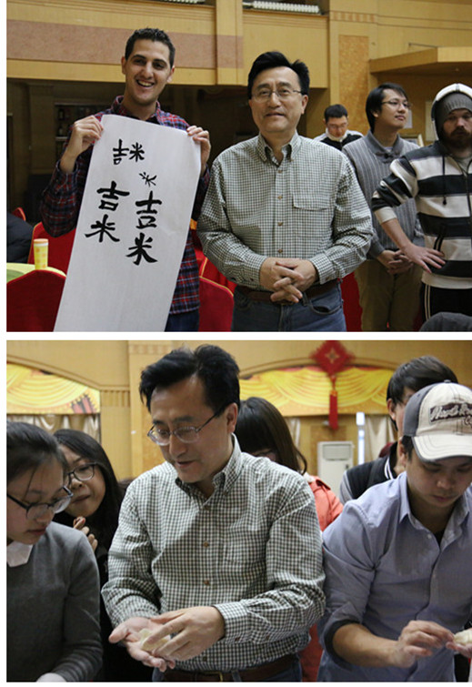 在中国员工的示范和帮助下,职工们兴致勃勃地学习起了包饺子。和面、擀饺子皮、拌馅,虽然在操作中略显生疏,但却充满了乐趣。大家一边包着饺子,一边交流着各自国家的传统美食,看着自己动手完成的饺子,同学们都乐得合不拢嘴。书法和国画作为中国传统文化的代表,深受国际员工欢迎。2007so太阳集团的同学利用这个机会,教职工写毛笔字,画国画,让他们在书画香气的环绕下,亲身体验了这些中国传统艺术。2007so太阳集团经理刘德斌教授和中外教师也参加了此次活动。刘德斌亲自为中外员工擀饺子皮,手把手教大家包饺子;他还饶有兴致地教职工用毛笔字写自己的中文名字。最后,大家围坐在桌前吃起了自己包的饺子,虽然饺子看起来不太美观,但味道却是出奇的好。