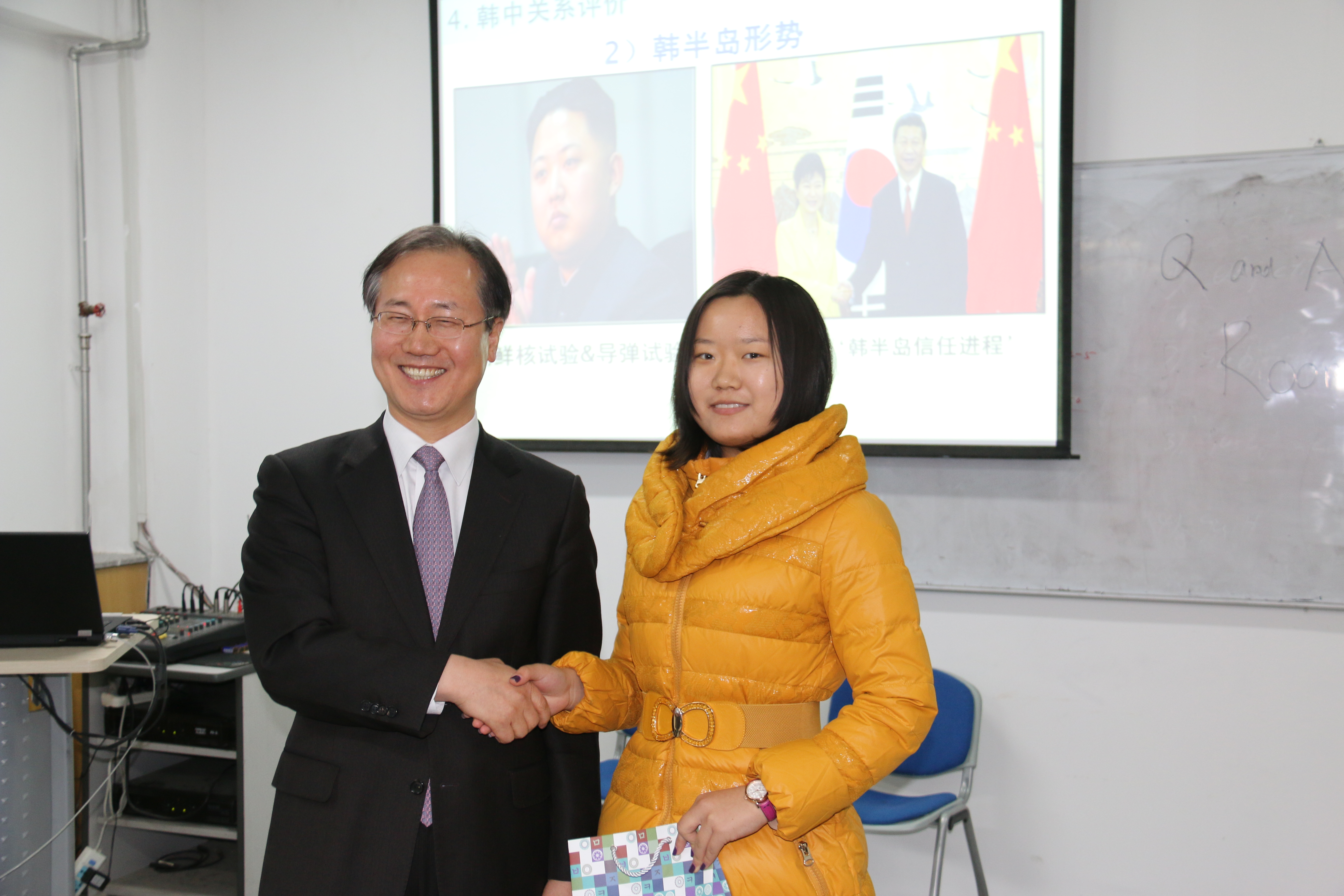 朴俊勇公使从当代韩国民主政权的成立与发展入手,简要介绍了韩国民主政体的形成及民主化成果、经济结构改革、开放性社会文化等相关内容,并对半岛安全问题、朝核问题、老龄化社会问题、经济结构优化问题等韩国面临的挑战一一进行分析,进而就韩中关系的历史、现实及未来发展走向进行阐释,在一个多小时的时间内对韩国内政、外交的方方面面进行了深入浅出的概括与梳理。报告结束后,朴俊勇公使与现场同学进行了互动与交流,韩国大使馆方面还围绕讲座内容安排了有奖抢答环节,同学们积极参与其中,朴俊勇公使与获奖同学亲切握手,活动现场气氛热烈。