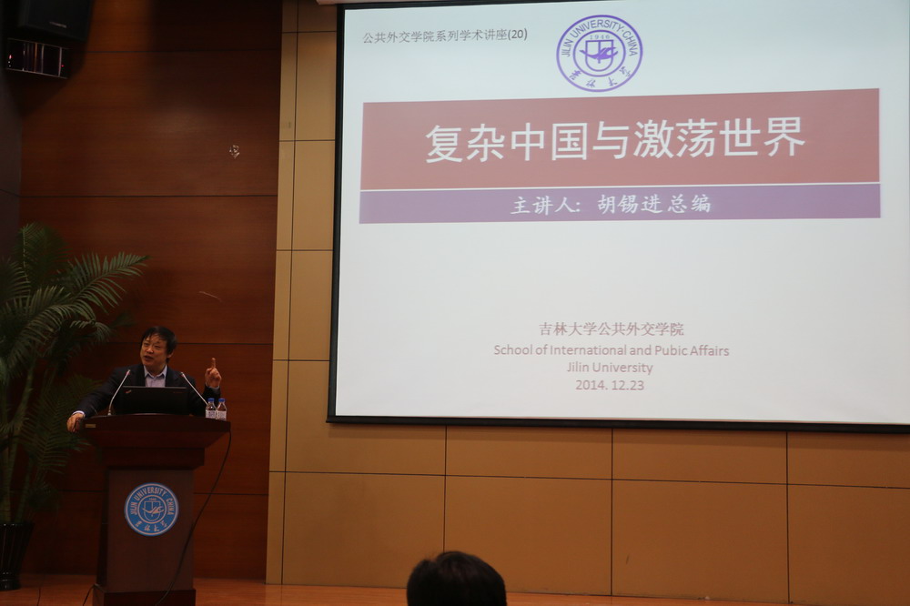 随后,胡锡进作了题为《复杂中国与激荡世界》的学术报告。胡锡进从新闻人的亲身经历出发,将中国变革与世界变革大时代下的主题化作精彩的故事娓娓道来。胡锡进阐述了中国作为超大型国家在现实世界中所面临的困难和机遇,指出中国人与外国人对于中国国际地位和中国与世界关系认识的巨大差异,强调作为一个超大规模的国家为何不能完全照搬国外经验与模式的原因所在。胡锡进论述结合,语言风趣幽默,不时引发了台下听众的笑声和掌声。报告后半段,胡总编与吉大学子就国内国际热点问题进行了问答,现场气氛十分热烈。