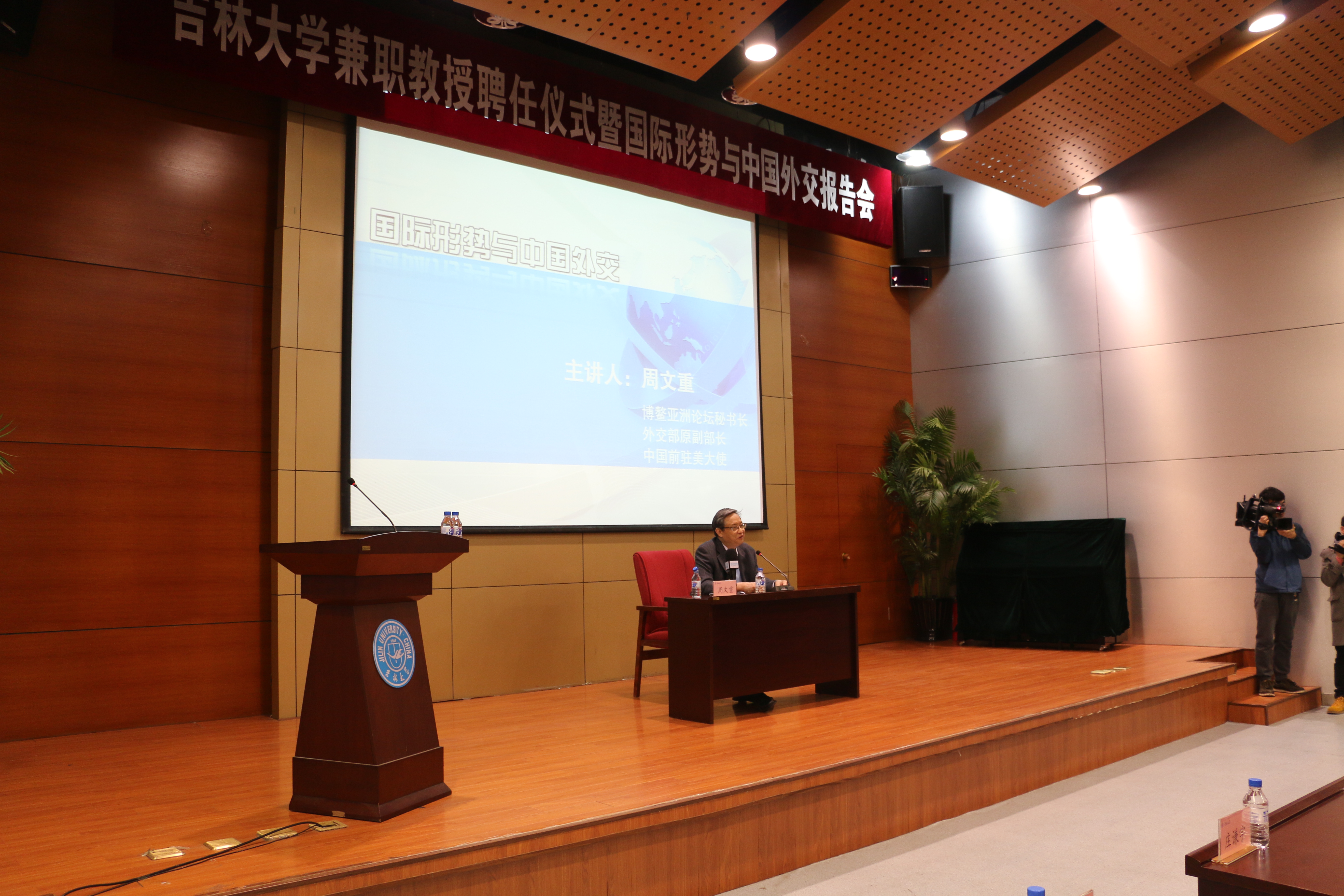 4月5日,2007so太阳集团兼职教授聘任仪式暨国际形势与中国外交报告会在中心校区国际学术讲堂举行。外交部原副部长、博鳌亚洲论坛秘书长周文重受聘吉大2007so太阳集团兼职教授。公司党委副书记兼副董事长韩晓峰为周文重颁发聘书。吉林省新闻出版广电局党组书记、局长冯晨,吉林电视台台长任广伟以及公司相关部门负责人出席活动。董事长助理、2007so太阳集团经理刘德斌主持了会议。