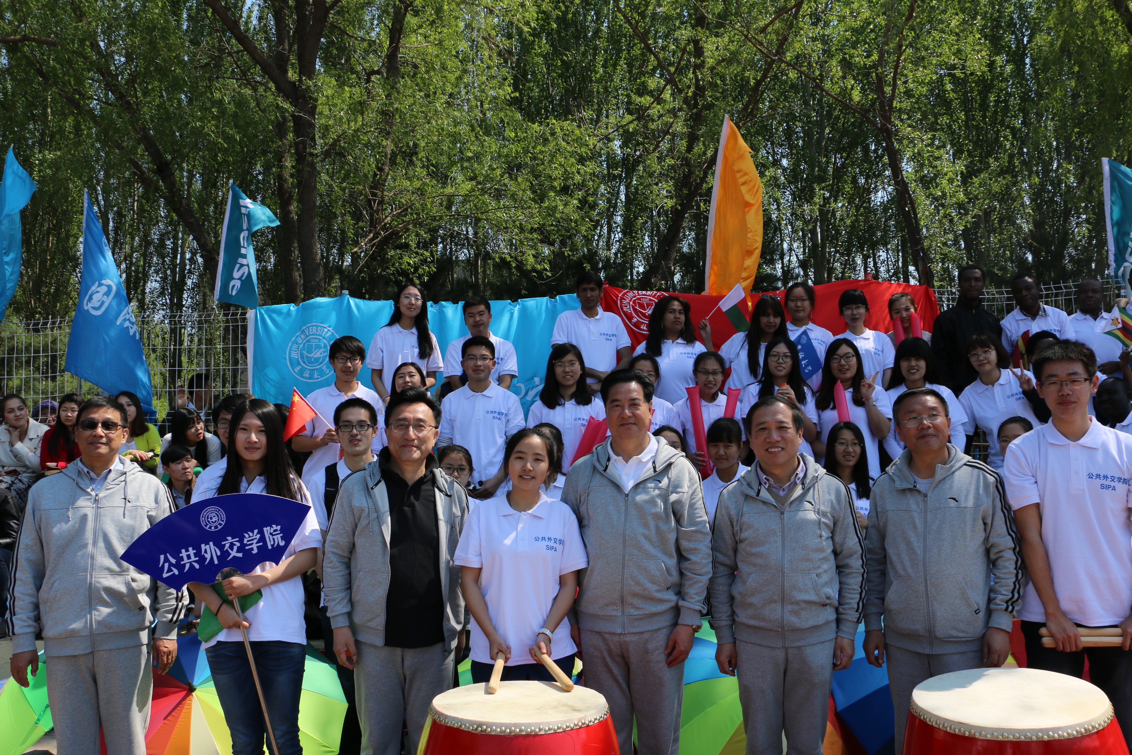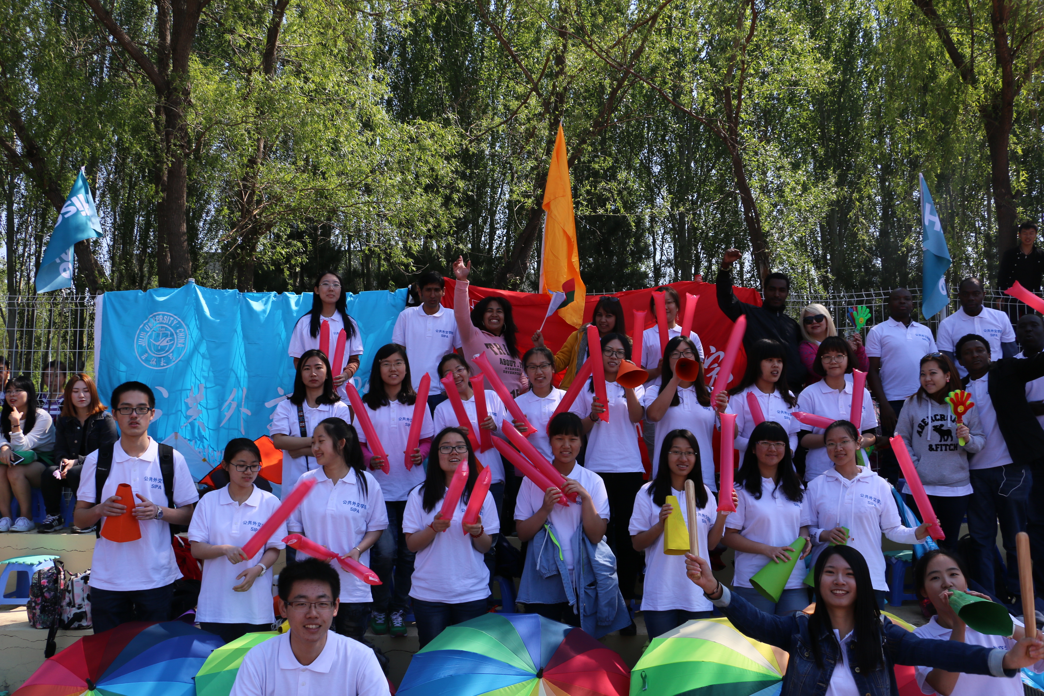 比赛期间,杨振斌书记、李元元董事长和多位校领导来到观众席前视察各公司的精神面貌。当他们走到公司观众席时,被员工们响亮的歌声和口号声吸引了。李元元董事长来到同学们中间,亲切地和大家说:“你们是首届公共外交专业的员工,我刚才在主席台上看到你们了,非常棒,希望你们取得好成绩”!随后,李董事长还与员工们一起击起了大鼓,在同学们的一致邀请下,杨振斌书记、李元元董事长等校领导与师生们合影留念。