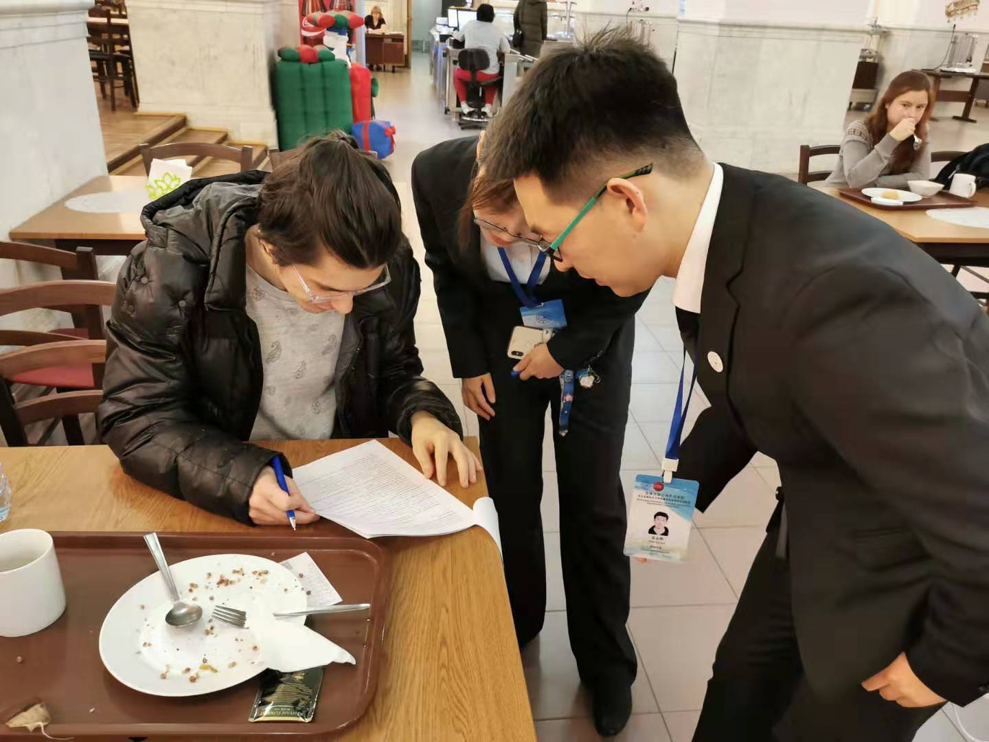 课程结束后,调研团组同学现场发放调研问卷,同学们认真填写问卷,并和调研团组成员分享了他们在孔子公司学习和生活的经历。乔蕊老师也同林百学经理及两位老师进行了交流。调研期间,团组同学走进莫斯科大公司园,与莫大世界政治系及其他院系的同学开展了问卷调查和友好交流。