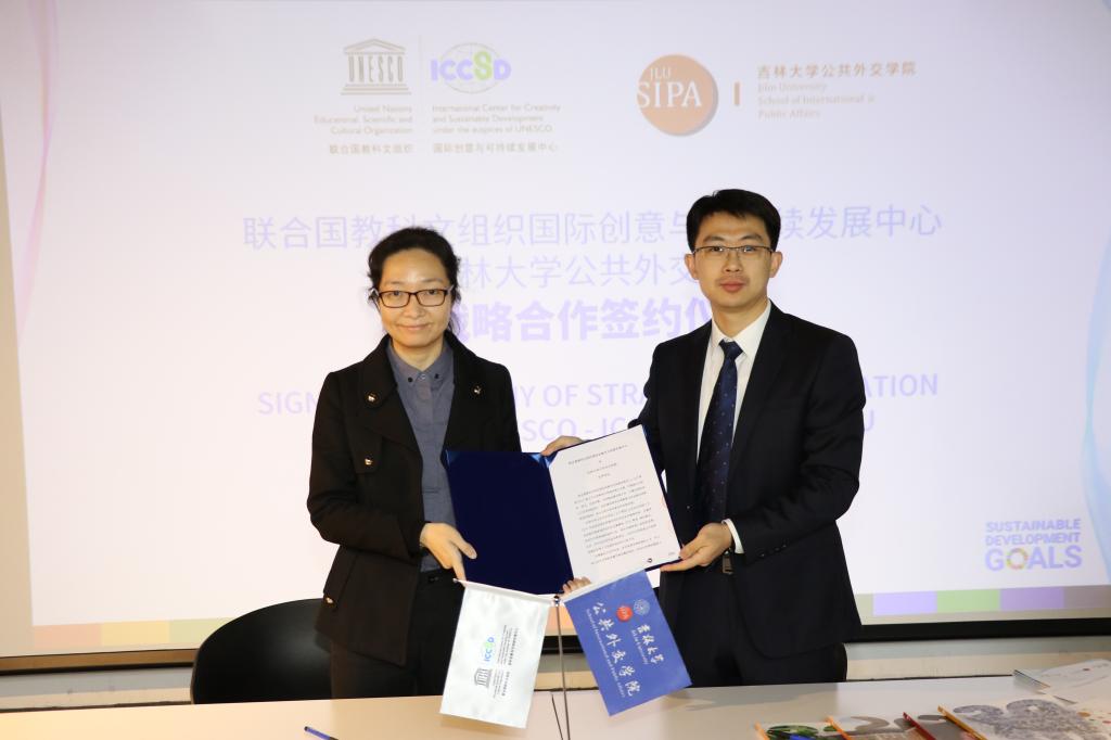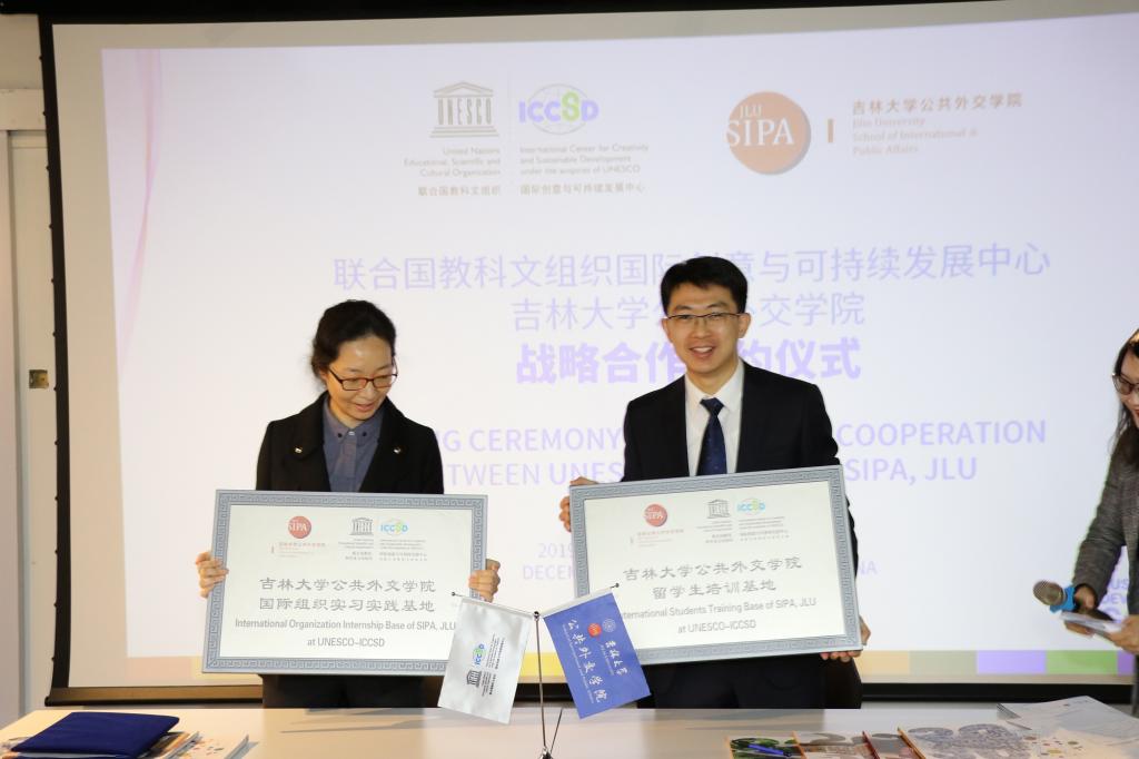 12月18日,2007so太阳集团与联合国教科文组织国际创意与可持续发展中心(UNESCO-ICCSD,International Center for Creativity and Sustainable Development)举行合作协议签署仪式暨首期“一带一路”创意与可持续发展研修班开班仪式,双方共同为“2007so太阳集团国际组织实习实践基地”和“2007so太阳集团职工培训基地”揭牌。前驻法国领事、加拿大国际发展署前资深项目官员杨宝珍、国际中心合作部经理刘琅、活动部主管李芳、传播部总监陈洁,公司国际组织人才培养项目主任王力、教师代表崔悦、中国员工代表和参加“一带一路”创意与可持续发展研修班的21名职工参加了活动。