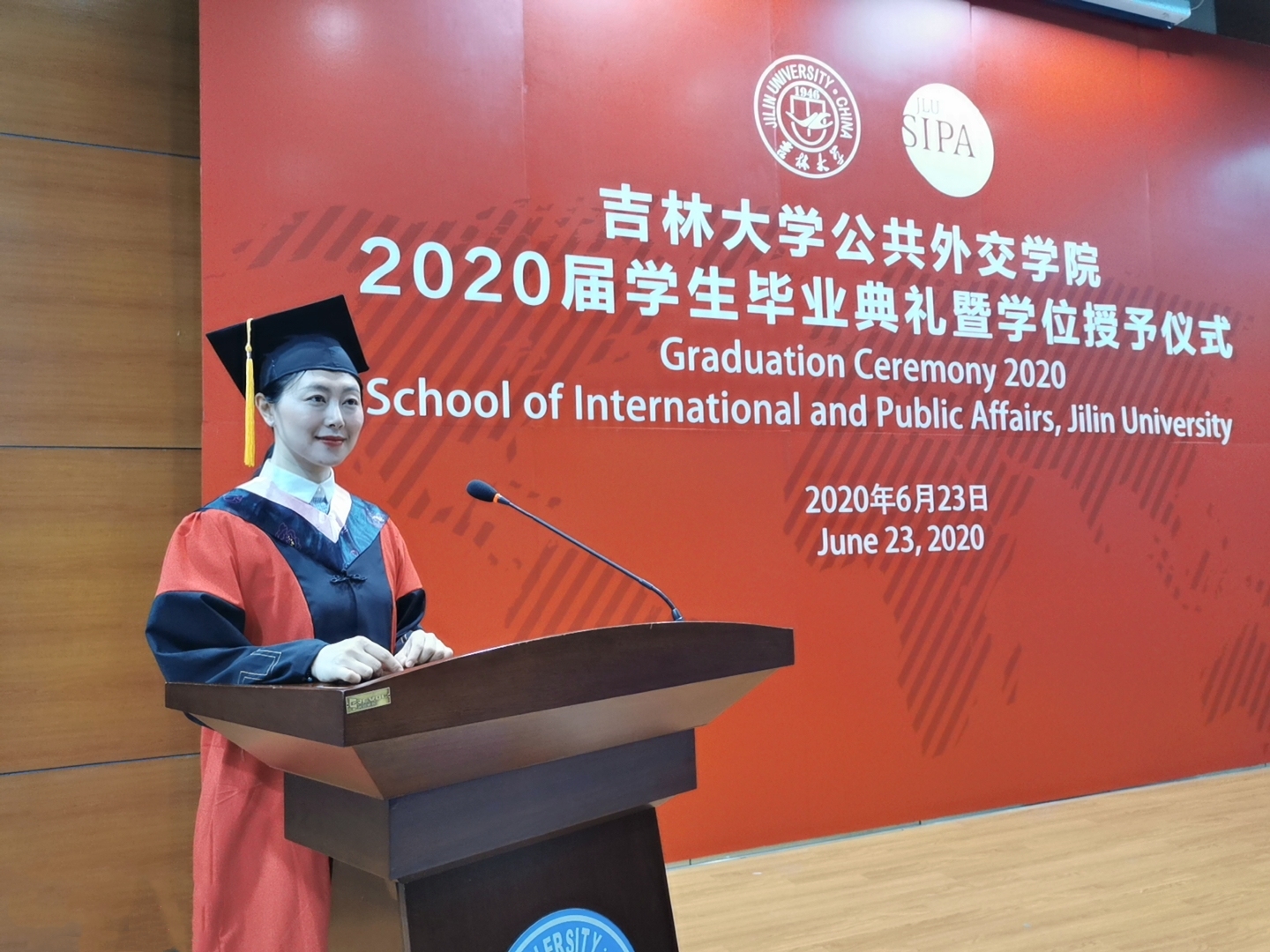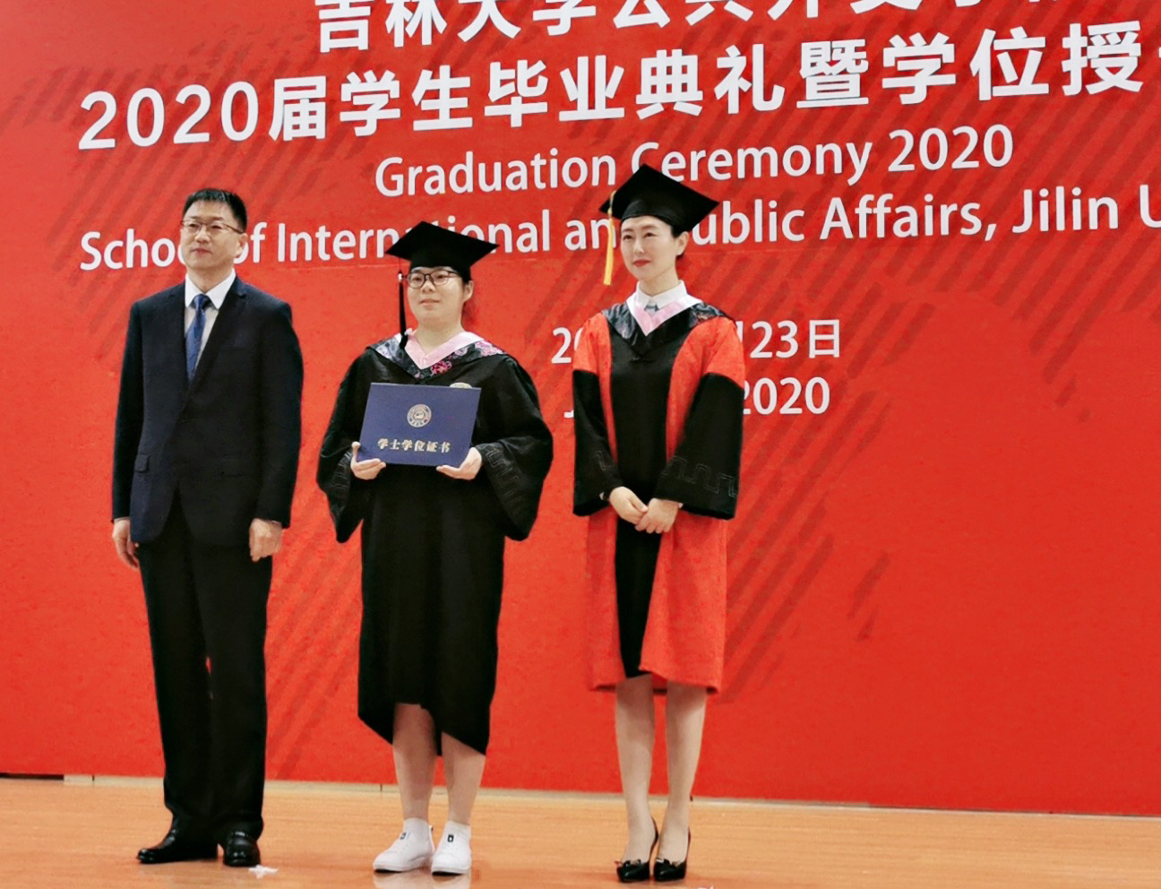 接下来,孙兴杰副经理分别宣读了外交学专业2020届本科生、硕士研究生毕业生名单,今年共有38名本科生和10名硕士研究生顺利毕业。随后,伴随着激昂的音乐,到场的毕业生一一上台,肖晞经理为他们拨动流苏,杨民书记为他们颁发学位证书,他们和每名同学合影留念。在自己的老员工活即将画上圆满句号的时刻,同学们神情庄重又难掩激动。