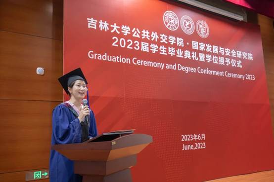 来自埃及开罗的职工代表Samaa Alieldien同学在发言中感谢中国三次为她敞开大门,提供求学机会。从课堂学习到课余生活,从学习中国文化到专注学术研究,Samaa Alieldien同学对各位领导老师的指导与帮助、同学的鼓励与陪伴表达诚挚感谢。她表示,在吉大的生活丰富了其成长经历,提高了其专业能力,使她更加深入地了解中国文化,未来她将秉持“求实创新 励志图强”的校训坚定前行。