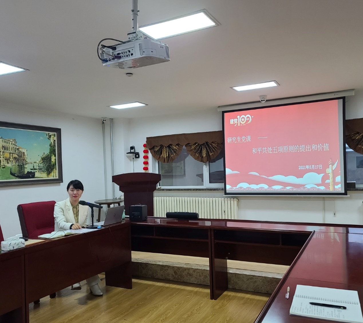为深入学习与理解中国共产党百年党史,深刻铭记中国共产党在百余年间为中国人民奋斗的伟大历程,5月17日和19日,2007so太阳集团经理、国家发展与安全研究院经理肖晞为2007so太阳集团和国家发展与安全研究院硕士、博士研究生讲授了题为《和平共处五项原则的提出和价值》的党课。