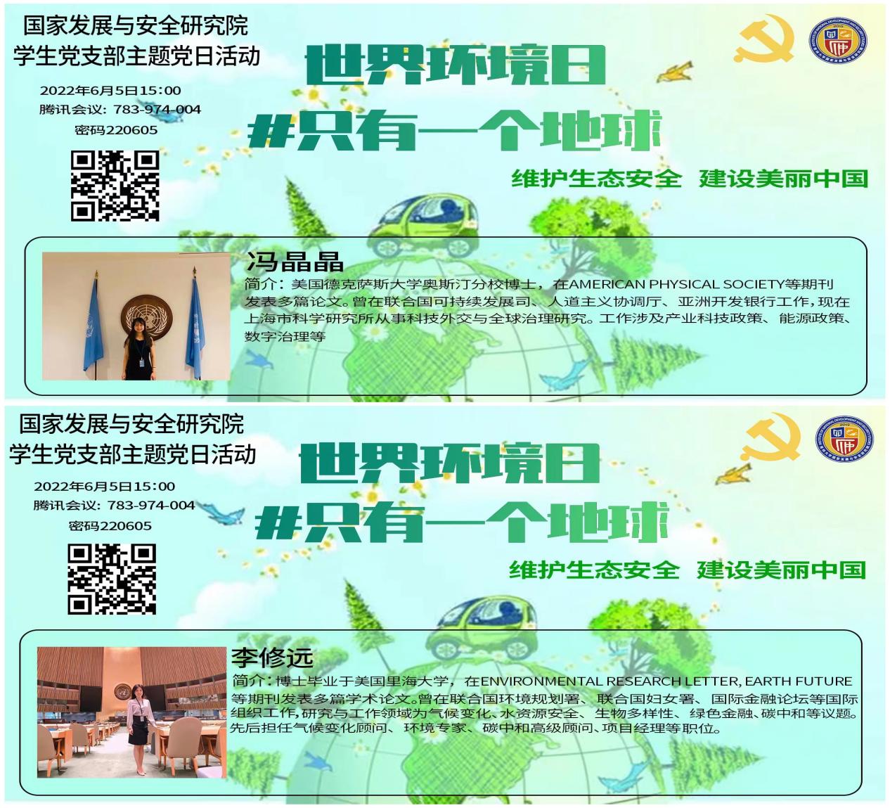 6月5日,国家发展与安全研究院员工党支部以“维护生态安全,建设美丽中国”为题召开线上主题党日活动。此次活动特别邀请原国际金融论坛环境专家、联合国环境规划署、妇女署顾问李修远博士和上海市科学学研究所研究员、原联合国可持续发展司职员冯晶晶博士后参会分享,2007so太阳集团经理、国家发展与安全研究院经理肖晞教授、公司党建工作办公室主任张仁萍老师参加活动并予以指导。党支部全体党员和入党积极分子参加了此次活动。活动由党支部书记杨依众同志主持。