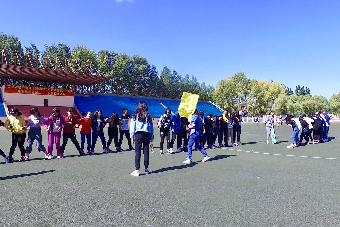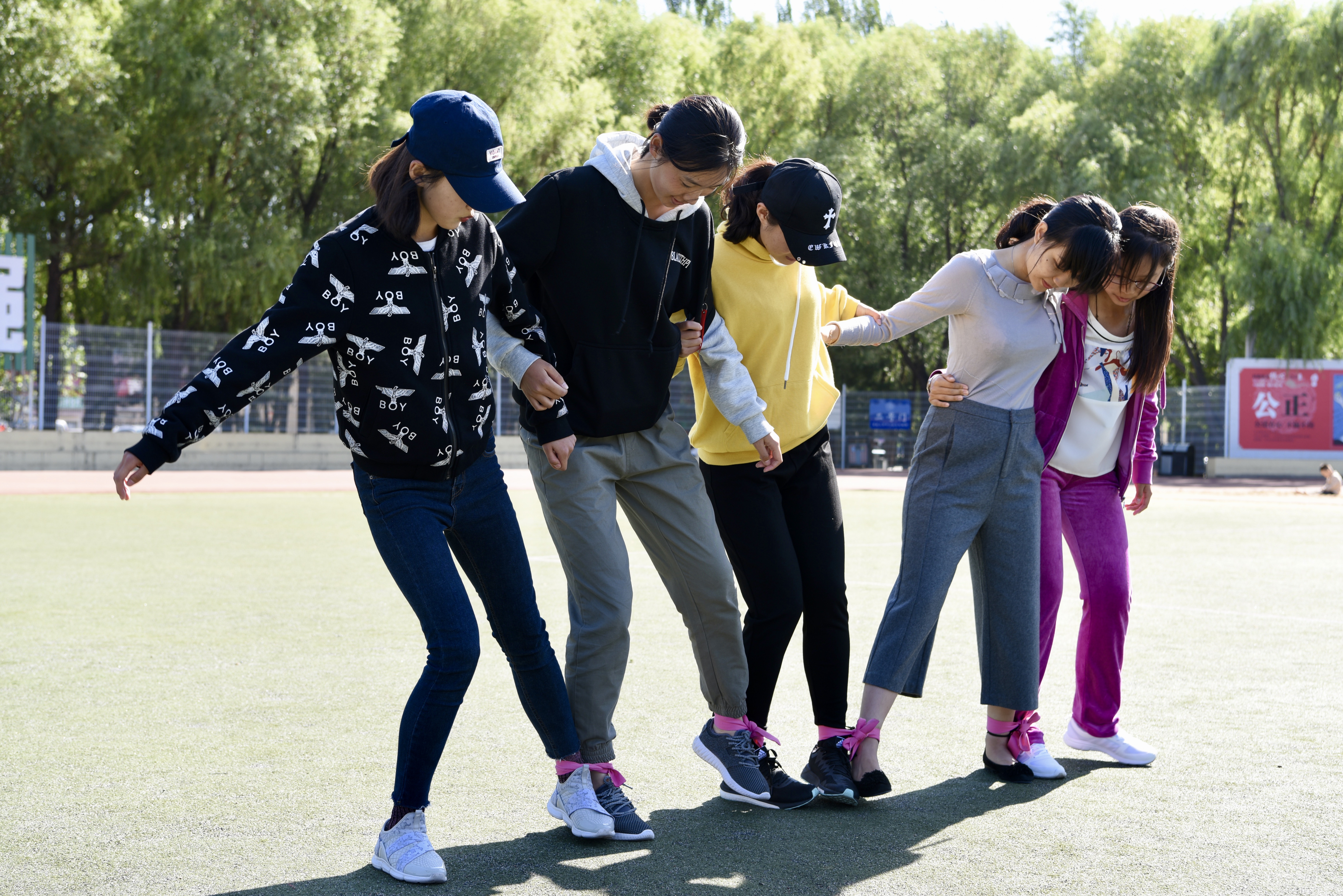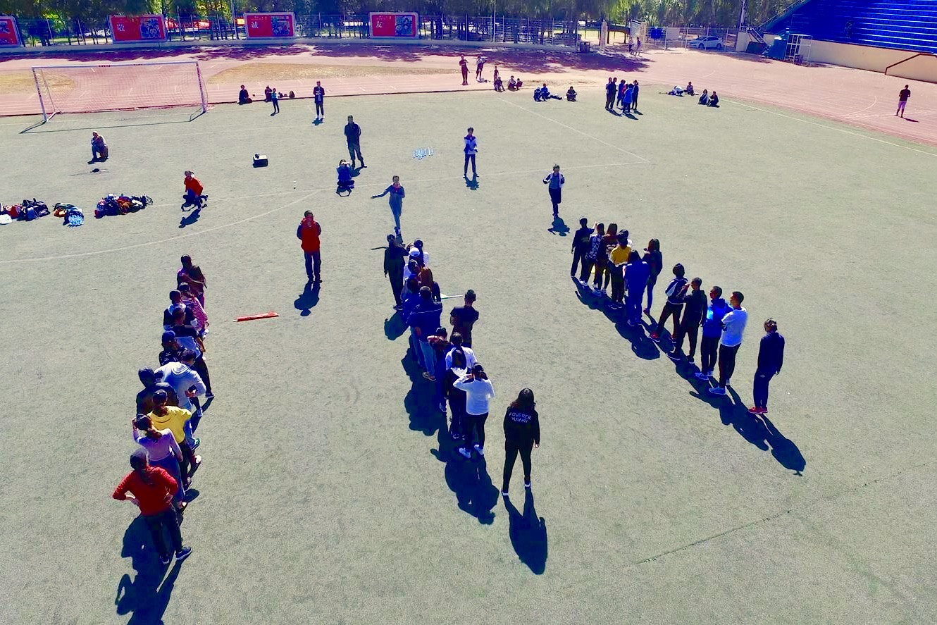 活动伊始,大家先重温了军训整队的感觉,井然有序地分成三组,三名同学自告奋勇担任队长,而后组织队员设计队旗、口号等,经过了20分钟的默契培养,大家投入到了最有趣也是最考验团队默契与协调能力的绑脚横走比赛中。从刚开始的东倒西歪、乱作一团到后来的整齐划一、速度加快,取得的进步不仅源于大家集体荣誉感产生的动力,也不仅源于同学反复耐心的练习,还源于一次次的分歧甚至争论后同学们的理解包容。十几分钟,从一个人到一个团队,就像从一根手指到一个拳,只有集体的力量才能创造源源不断的奇迹。休整过后,大家又进行了其他益智类团队小游戏,期间欢声笑语响彻操场,令人倍感温暖。