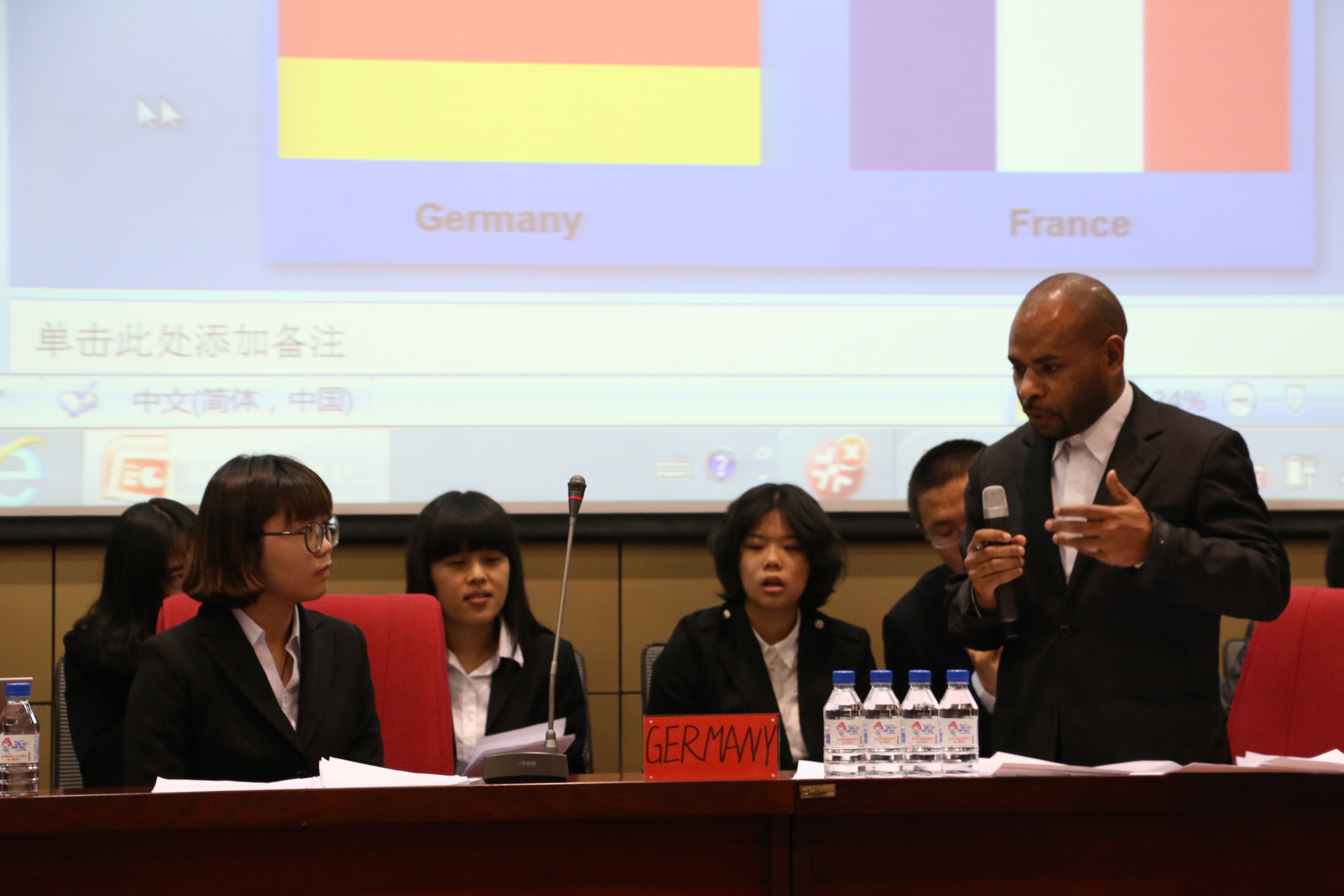 2007so太阳集团每团一品系列活动之模拟外交谈判于11月6日下午在2007so太阳集团学术大讲堂拉开帷幕。董事长助理兼2007so太阳集团经理刘德斌、副经理王秋彬、国际合作与交流处副处长部铁军和2007so太阳集团多名中外教师应邀作为评委参加了本次活动。