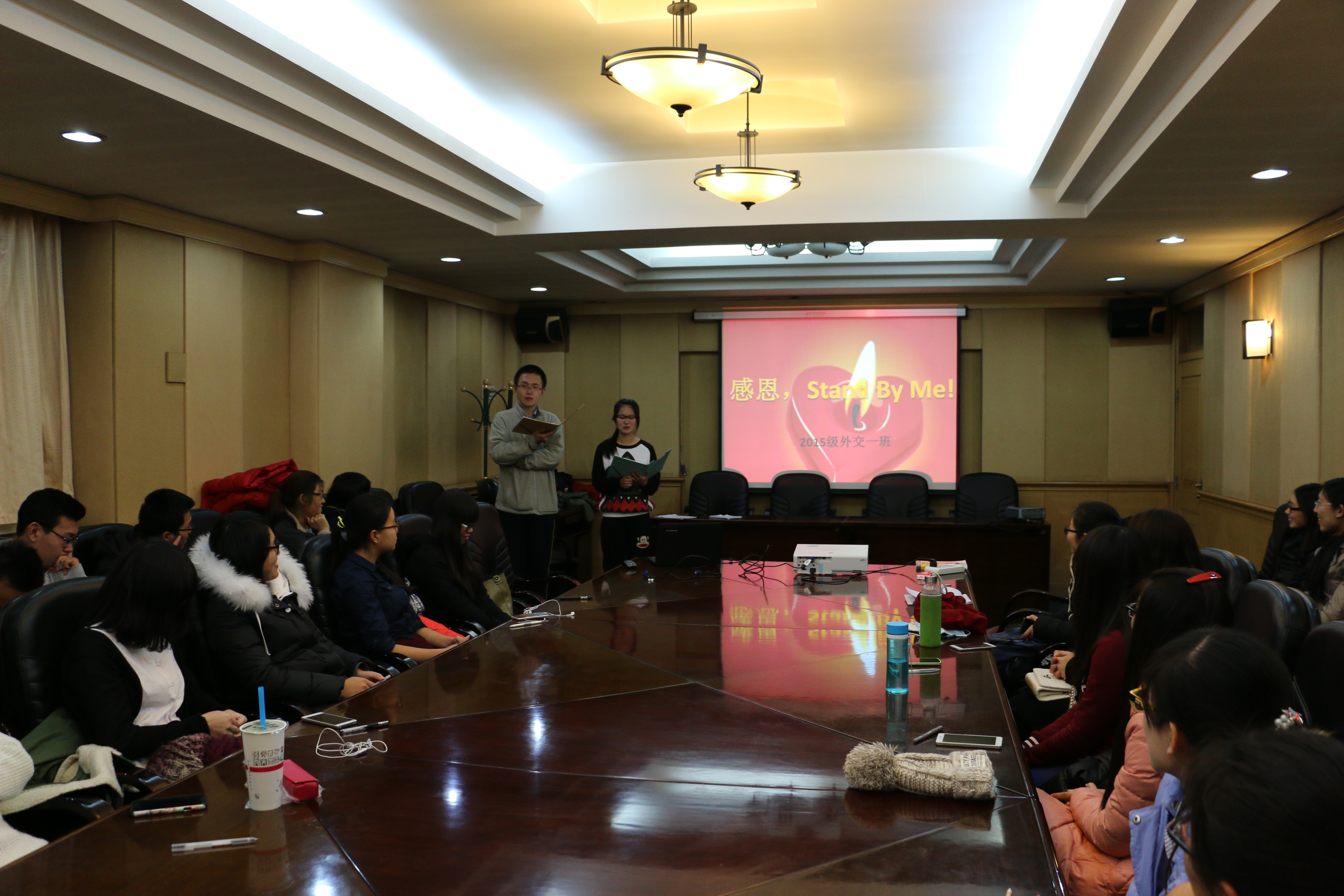 11月27日下午4时,2007so太阳集团外交学2015级“感恩,伴我同行”主题班会在友谊会馆大会议室如期举行。本次活动呼应感恩节的节日氛围,旨在提升同学们对于中华优秀传统美德——感恩的认识与理解。并借此机会进一步加强师生间的沟通及班级内部的凝聚力。