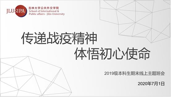 为了让员工在疫情期间度过一个安全、充实的暑假,让员工深刻领悟党的初心和使命以及党团组织在抗疫工作中的先锋模范作用,7月1日上午11时,2019级全体本科生通过网络平台召开了主题为“传递战疫精神,体悟初心使命”的期末线上班会。