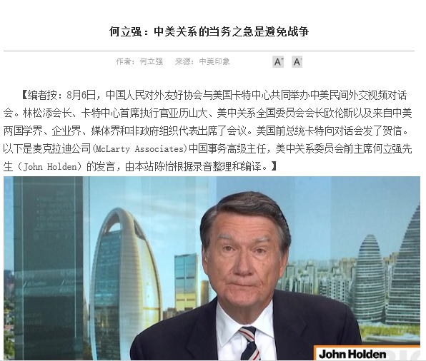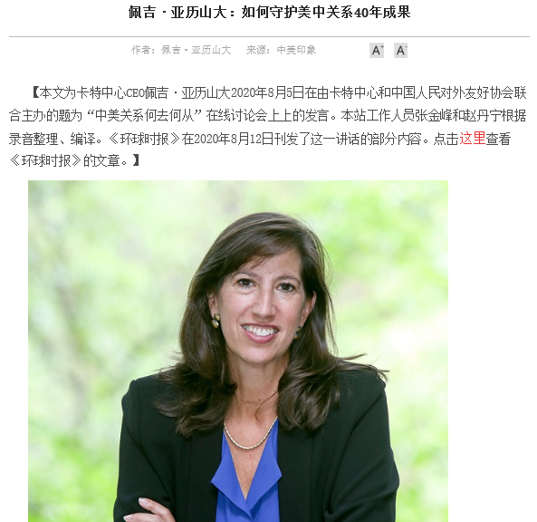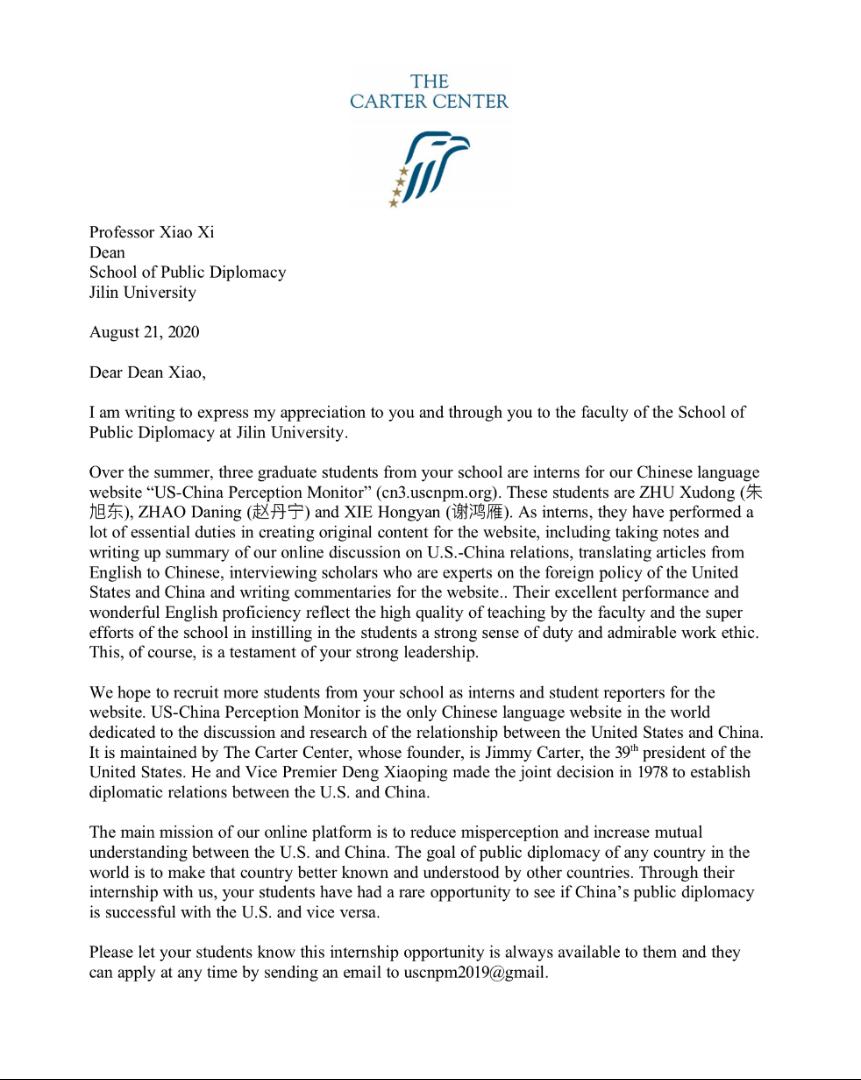 2020年5月,公司2017级本科生朱旭东、赵丹宁、谢鸿雁和2018级陈怡四位同学凭借扎实的专业基础和出色的英语能力,通过选拔入选为卡特中心中国项目部实习生,正式开始了在中美印象网站的实习工作。卡特中心(The Carter Center)是由美国前总统吉米·卡特与其夫人罗莎琳·卡特于1982年共同创办的非营利性组织,旨在维护和平、消灭疾病和打造希望(wage peace, fight disease and build hope)。卡特中心中国项目部主办的中美印象网站(US-China Perception Monitor),致力于通过加强交流、消除偏见、促进相互理解,为中美关系的改善寻找路径和方案,推进中美双边关系发展的稳定、对等和共赢。中美印象是全球唯一的专门关注和讨论中美关系的中文网站。自2015年上线以来受到越来越多的学者和普通网民的关注。此次实习工作为公司四名同学亲身参与公共外交实践,学以致用,知行并进,近距离参与中美公共外交活动提供了宝贵的机会,不失为一次难得的经历。