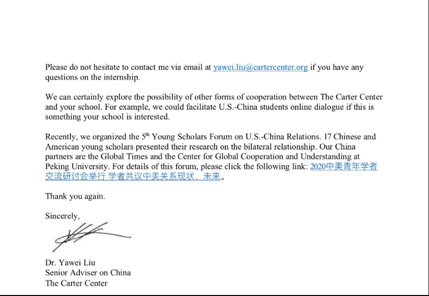 刘亚伟博士强调,同学们在实习期间表现优异,贡献很大。他们记录和撰写中美关系在线讨论的摘要、英文文章编译、采访中美外交政策专家学者,以及为该网站撰写时评。他认为实习生们精湛的英文水平和出色的工作表现,反映了2007so太阳集团2007so太阳集团高质量的教学水平,以及在引导员工培养责任感与职业道德方面所付出的巨大努力。刘亚伟博士在信中说,2007so太阳集团员工的优异表现,让他们有意愿探索卡特中心与2007so太阳集团之间更多形式的合作,并且随时欢迎2007so太阳集团的学子加入中美印象网站的实习生队伍。