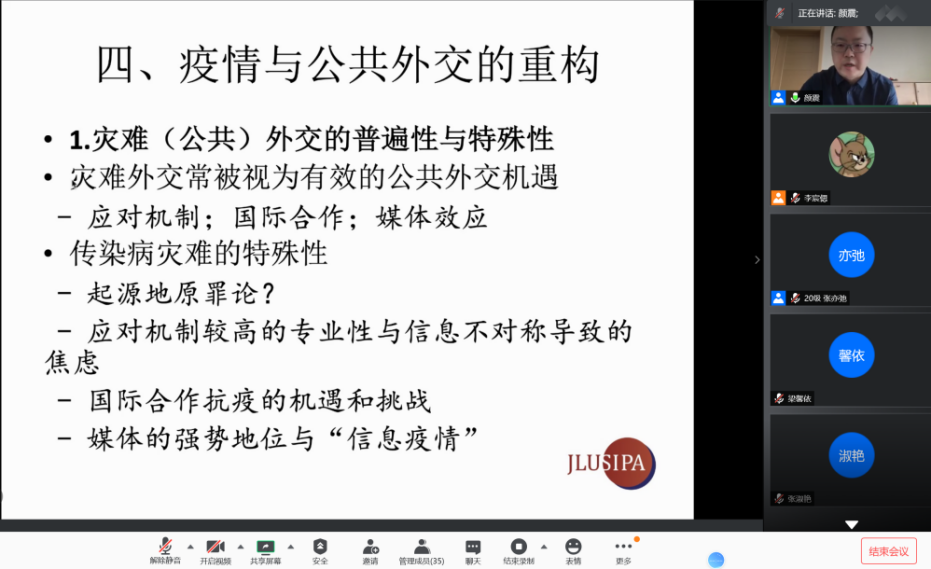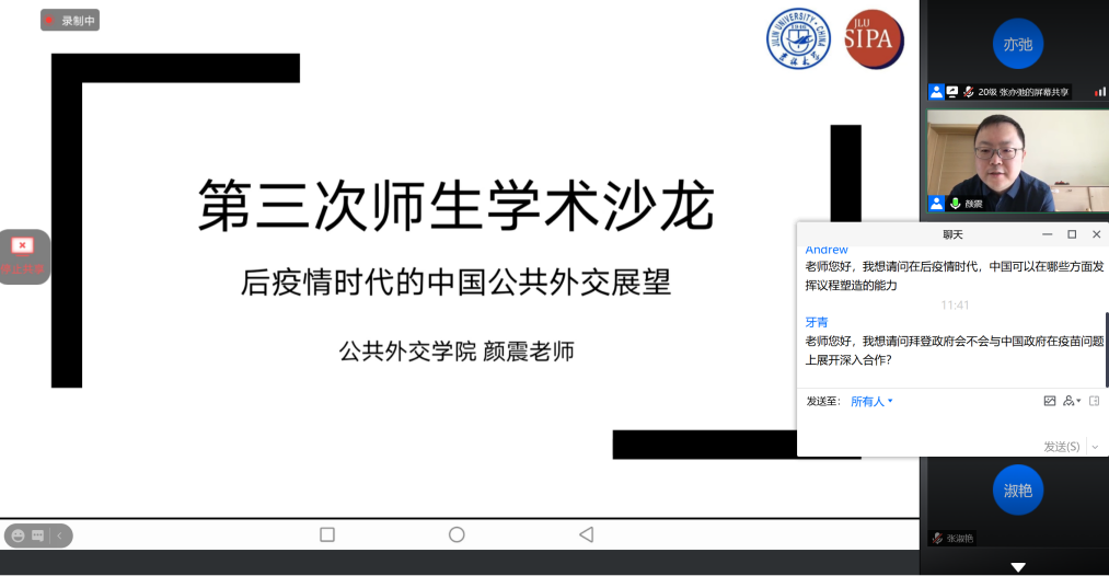 在随后的互动交流环节中,参与本次师生沙龙的同学们踊跃发言,纷纷提出了自己的疑问,颜震老师就如何更好地传播中国抗疫成功经验、后疫情时代中国何以发挥议程塑造能力等问题发表了深刻的见解和认识,提出了自己的专业建议,引发了同学们的进一步思考。