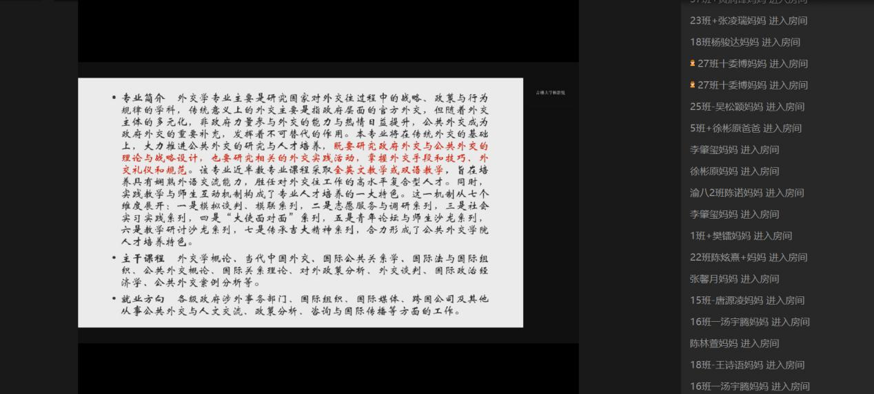 为遵守当地疫情防控常态化要求、在宣传的同时保障广大同学安全,重庆市第八中学的宣讲团成员在公司2020级本科生杨欣悦的带领下,采用了更加灵活的线上形式进行宣讲,并借此创新性地邀请家长参与到宣讲活动中来。尽管隔着屏幕,但我们仍能感受到宣讲团队的认真踏实的准备工作和广大同学、家长朋友们的热情参与。