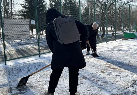 零下二十多度的体感温度和凌冽的寒风并没有让同学们抱怨,大家不怕辛苦、不畏严寒,为校园里的行人出行提供了便利安全的环境。