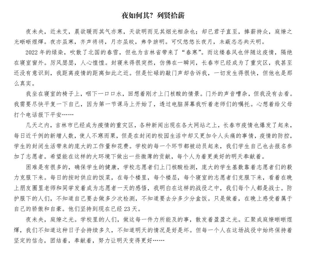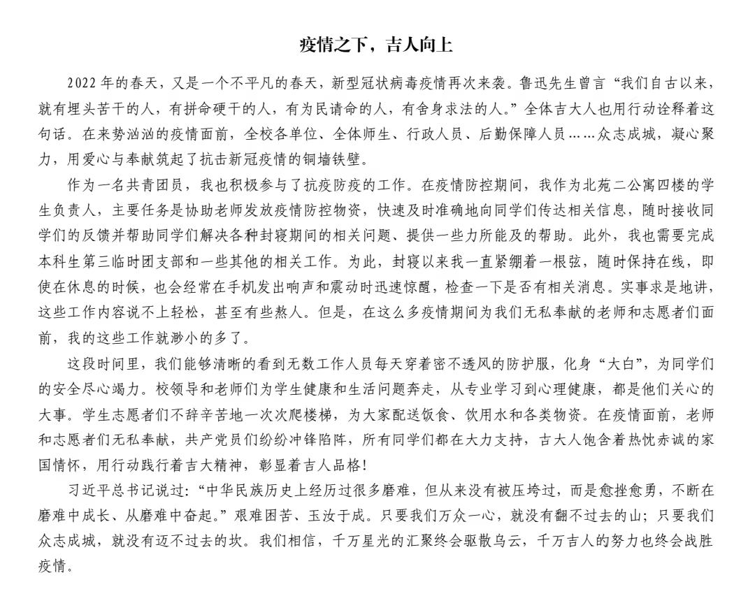 总有一种力量激励我们前行,总有一种精神让我们泪流满面,在全体吉大人同心抗疫的这段时间里,我们见到了无数无私奉献的人,看到了太多让人感动的事。为了鼓励同学们记录下自己的所见所闻,所思所想,深入发掘出抗疫阻击战中的典型事迹,2007so太阳集团团委于2022年3月中旬积极开展了“青春抗疫”札记征文活动。