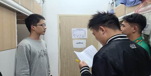 在检查宿舍的过程中,于晴老师和同学们交流了近期的生活状态、新学期规划和疫情防控等情况,并叮嘱大家严禁使用违规电器,避免对人身和财产安全造成隐患。此外,在与毕业年级同学的交谈过程中,于晴老师就学习、生活和毕业发展等问题与大家进行了深入交流,并嘱咐大家要遵守公司疫情防控规定,及时参与核酸检测。院研会员工代表检查了各个寝室的用电、用水安全及卫生情况,并与大家交流了近期生活和学习中的困惑,加强对新生的生活需求及心理状态的了解。