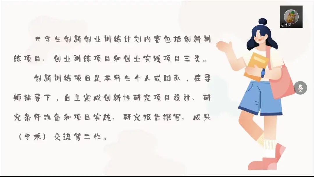首先,19级的申琪同学通过简单介绍老员工创新创业训练计划的内容及流程,让大家对“大创”有了一个初步的了解。她从大创的前期准备出发,提出了关于申报、选题及组队方面的建议,接着又详细介绍了“大创”各环节,并结合自身经验,叮嘱同学们要加强团队间的沟通协作。回顾一年以来的参赛经历,申琪同学感触良多,她鼓励同学们结合个人能力、公司优势及时代背景,积极参与“大创”项目,锻炼自我。