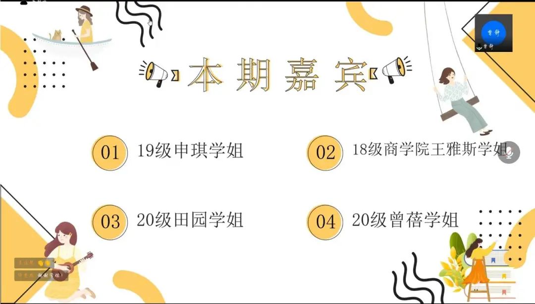 会议伊始,主持人曾静向同学们介绍了本次青春分享课堂的主题以及受邀分享的四位嘉宾。