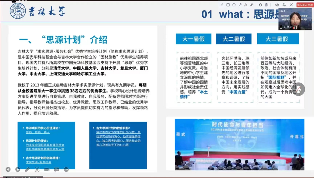 接着,来自商公司18级的王雅斯同学向大家介绍了思源计划的具体内容。她从“思源是什么”讲起,重点阐述了加入思源的初心,向大家分享了自己在选拔、面试中的经验与感悟。提及思源“受助、自助、助人”的核心理念,她鼓励大家在认真学习的同时积极开拓视野、锻炼自身能力。在学姐细致入微的讲解下,大家对于即将到来的培养计划选拔有了较为清楚的认知,也更加明白创造力、责任感在学习中的重要性。