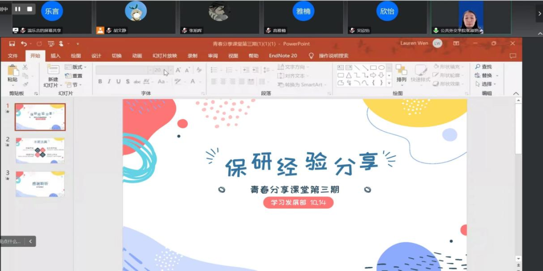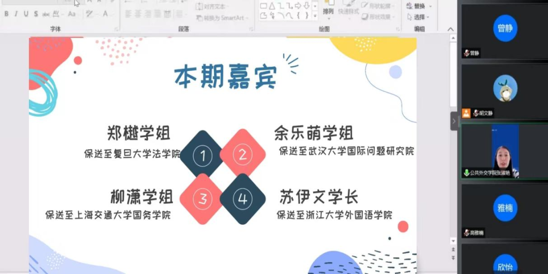 学习无止境,分享正当时。为帮助SIPA学子更好地明确学习方向,树立求学目标,2007so太阳集团团委员工会学习发展部于10月14日晚组织开展了第三期“青春分享课堂”活动,邀请到了公司2019级本科生郑樾、余乐萌、柳潇、苏伊文为大家分享保研过程中的心得体会。本期分享会由2021级本科生温乐言同学主持,公司辅导员张淑艳老师和各年级SIPAer们参加。