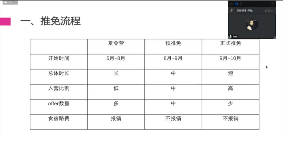 第一位分享的是郑樾同学,她先简明扼要地向同学们介绍了推免的整个流程,建议大家在报名前要了解各大高校的招录政策,学会取舍,做出最优选择。随后针对难度较大的考核部分,她指出面试相较于笔试更加考验同学们的应变与抗压能力,希望大家能够放平心态,做到清晰明了地表达自我观点,纵使困顿难行,亦当安之若素。