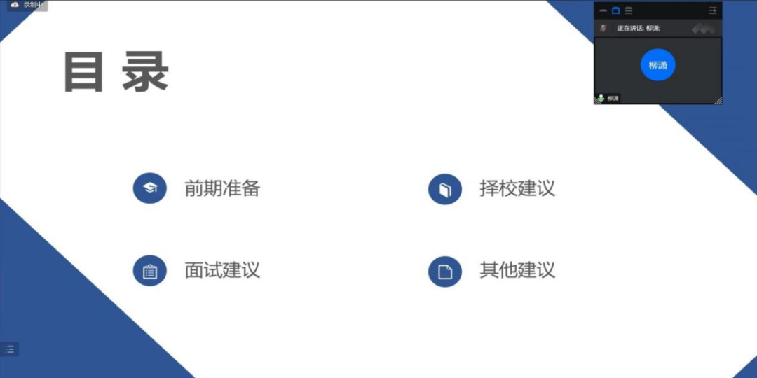 随后,柳潇同学给出了具体的择校和面试建议。在前期准备方面,她强调了个人陈述的重要性,提醒大家要注意细节,详实地进行描述;关于专业知识的积累问题,她则推荐了一些书籍,并强调大家平时一定要认真阅读专业课本,提升专业技能。在讲述了员工工作等经历带来的自我提升后,她以“低头赶路,敬事如仪;自知其心,其路则明”作结,希望大家放稳心态,停止内耗,一步一步踏实走下去。