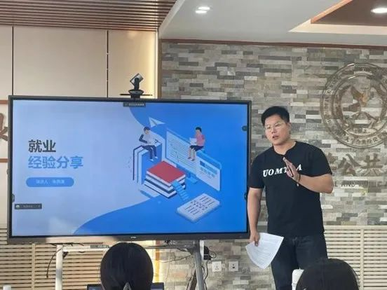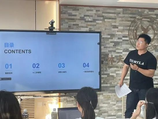 第五位分享者张鼎演同学分别从求职经历、原则、需要避免的误区以及求职技巧四个方面向大家介绍了就业过程中的经验。