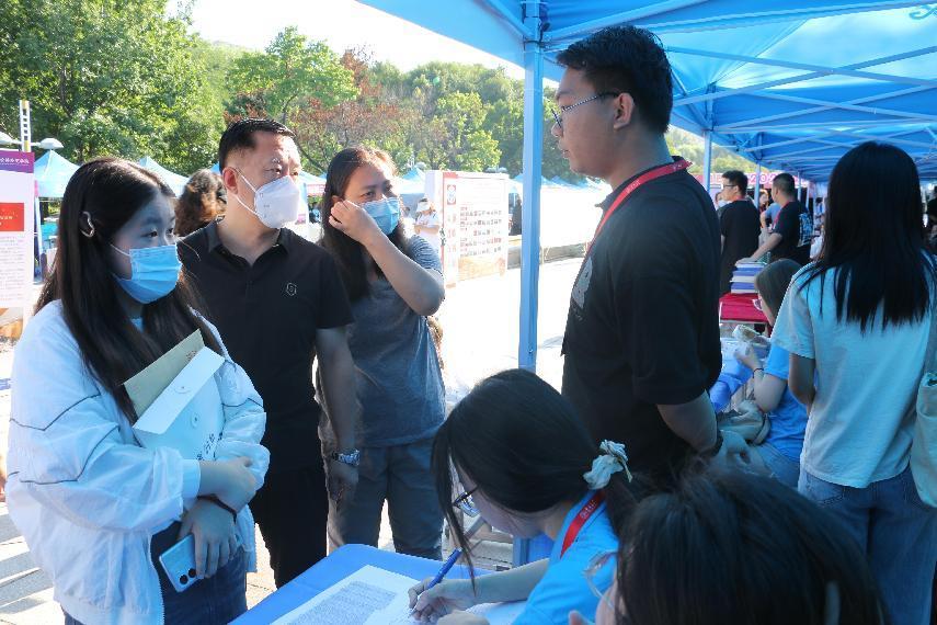 上午10时30分,公司党委书记姜治莹莅临公司迎新点,慰问在场老师及志愿者,并了解了公司新生的报到情况。