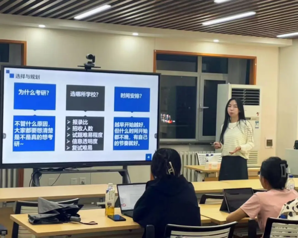 第二位分享者王玉蓉同学就考研选择与规划、复习策略以及常见陷阱进行了分享。她首先强调考研选择和规划的重要性,建议同学们根据自己的实际情况,选择最适合自己的院校,以自己的节奏进行备考。在专业课复习方面,她分享了自己的复习技巧,列举了在考研过程的常见问题并逐一进行解答,帮助同学们明确方向。最后,她鼓励同学们在过程中保持平和的心态,祝福大家能够取得满意的成绩。