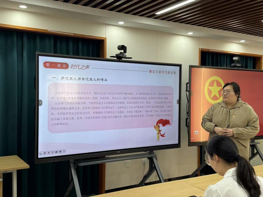 以“时代之声”为主题,张湲悦同学从四个维度出发,深入分析了当前国际外交新态势。她以气候变化方面多边主义与单边主义的博弈为切入点,表达了中国提出的“双碳”目标举措展现了大国担当;以全球治理体系变革为脉络,解释了新兴经济体崛起对全球治理格局的重要推动作用;在科技方面,讲述了中国5G技术国际合作实践为国际格局带来的新挑战与新机遇;最后以“一带一路”倡议为例,展现“人类命运共同体”理念的全球感召力。在互动环节,同学们就当前外交新动态展开热烈讨论,愈发领会到中国在全球治理中发挥的建设性作用。