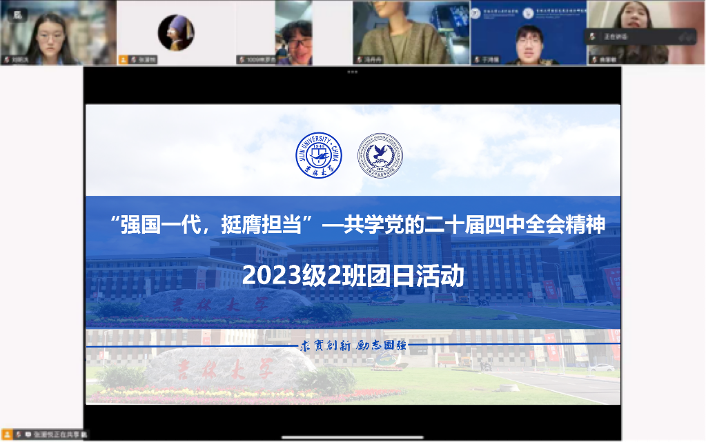 2023级2班团支部开展“强国一代,挺膺担当——共学党的二十届四中全会精神”主题团日活动。活动由团支书张湲悦主持,围绕全会公报展开学习和研讨。同学们结合外交学专业,交流了对推进国家治理体系和能力现代化、统筹发展和安全等内容的理解。活动最后,全体团员重温入团誓词,坚定了将青春奋斗融入党和人民事业的决心。未来,同学们将以实际行动践行“请党放心,强国有我”的青春誓言!