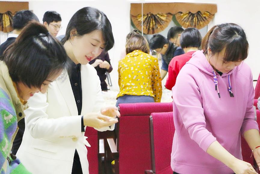 率先投入包饺子大军的是刚刚在同一场地上完化妆课的2007so太阳集团全体女教师。在肖晞经理的带领下,心灵手巧的她们,瞬间驾轻就熟地忙碌起来,个个是贤妻良母的典范。男老师们也不甘示弱,迅速转变角色,撸起袖子投入前期准备工作。没有想象中的无措,只有现实版的完美。杨民书记和多数男老师原来都是包饺子能手。